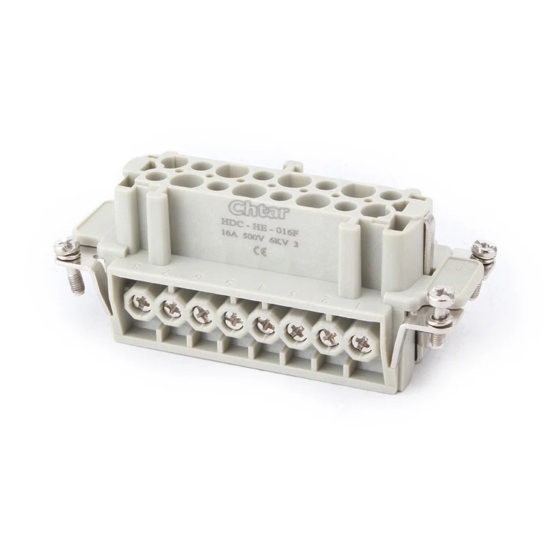 CHTAR యొక్క అధునాతన 16A HE-016-F/M ప్లగ్-ఇన్ హెవీ-డ్యూటీ కనెక్టర్ M/F 16 పిన్ ఇన్సర్ట్ హెవీ డ్యూటీ కనెక్టర్. ఇందులో మగ, ఆడ భాగాలు ఉంటాయి. ఇది H16B షెల్ హెవీ-డ్యూటీ కనెక్టర్‌కు అనుకూలంగా ఉంటుంది. సాధారణంగా, మగ భాగం మగ హౌసింగ్‌లో సమీకరించబడుతుంది లేదా కస్టమర్ అవసరాలకు అనుగుణంగా రివర్స్ ఇన్‌స్టాలేషన్ కోసం స్త్రీ కాంపోనెంట్‌లో సమీకరించబడుతుంది. ధృడమైన PC కేసింగ్ మెటీరియల్ మరియు వెండి పూతతో కూడిన ఇత్తడి పిన్నులు M/F 16 పిన్ ప్లగ్-ఇన్ హెవీ-డ్యూటీ కనెక్టర్ యొక్క వాహకత మరియు కార్యాచరణ ప్రయోజనాలను నిర్ధారిస్తాయి.