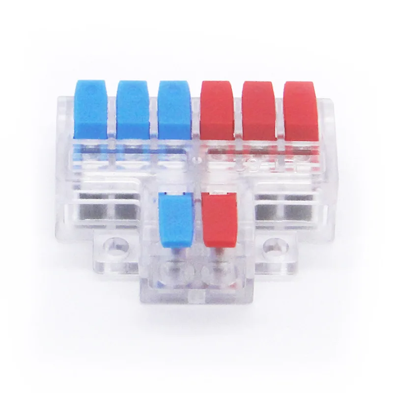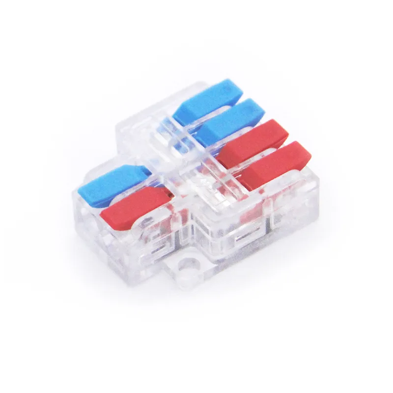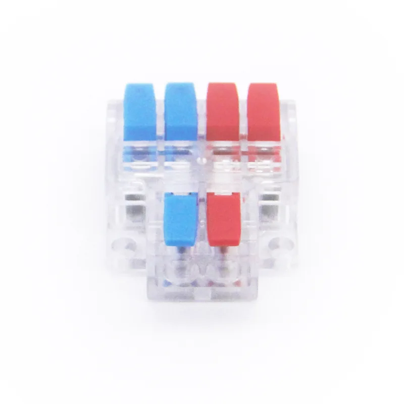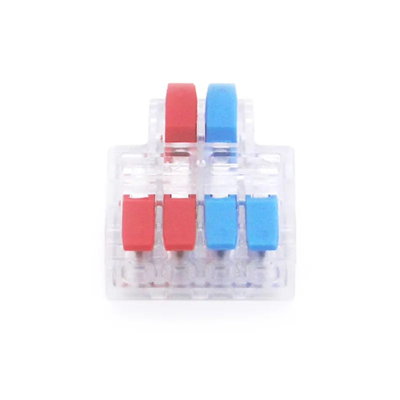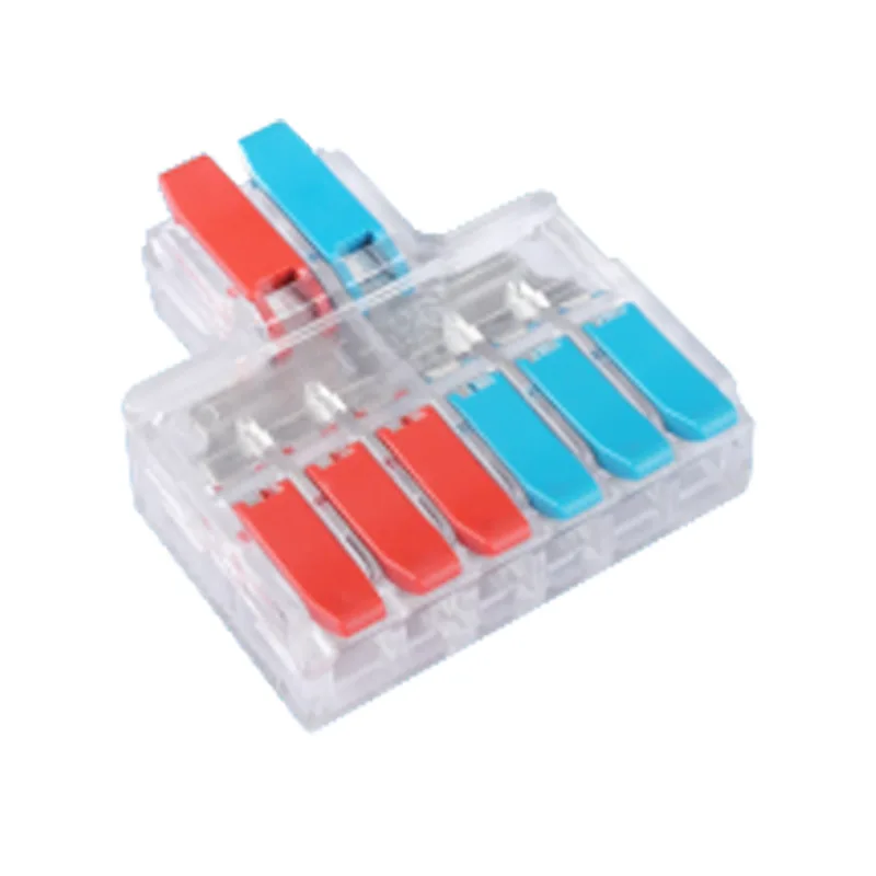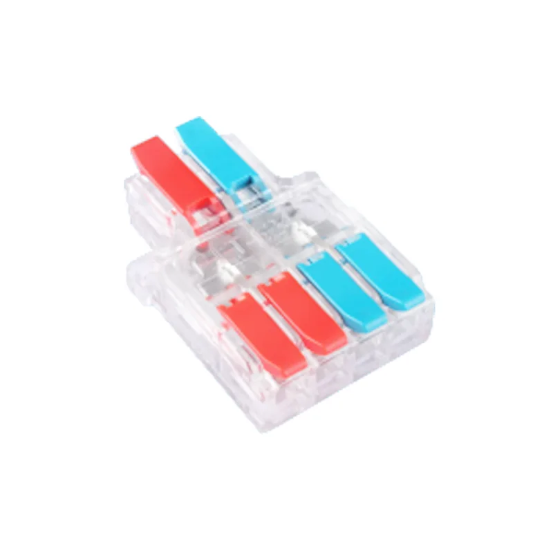 రెండు-ఇన్ ఫోర్-అవుట్ స్ప్లికింగ్ వైర్ క్విక్ కనెక్టర్‌లు పెద్ద-గేజ్ కేబుల్‌ల కోసం రూపొందించబడ్డాయి, 6 చదరపు మిల్లీమీటర్ల వరకు కనెక్షన్‌లకు మద్దతు ఇస్తుంది. ఇది 35 ఆంపియర్ల వరకు ప్రవాహాలను నిర్వహించగలదు. వైరింగ్ మార్గాలను స్పష్టంగా గుర్తించడానికి వారు వివిధ రంగుల హ్యాండిల్స్‌ను ఉపయోగిస్తున్నారు.